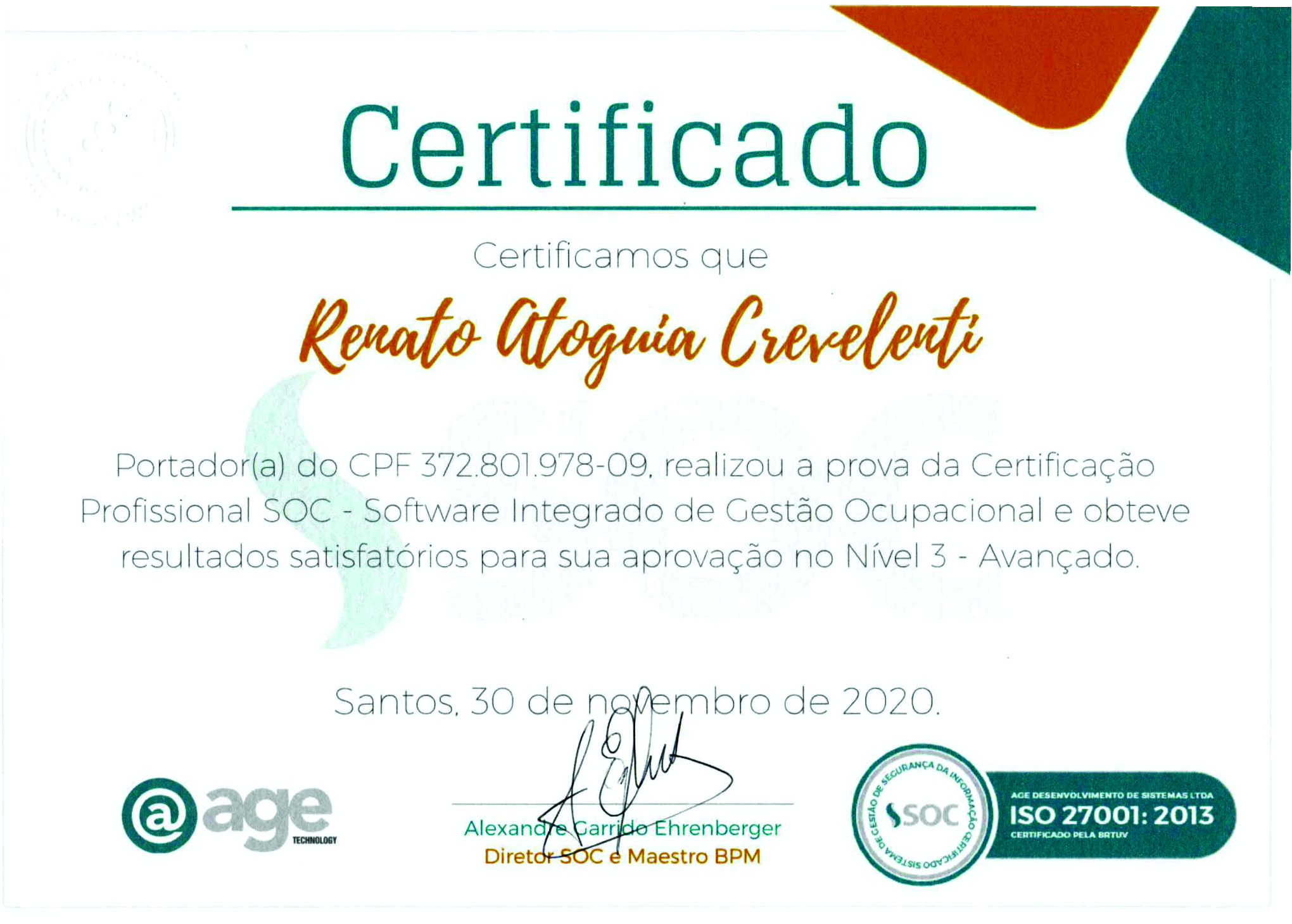 Em 30 de Novembro de 2020, Renato Atoguia Crevelenti enfrentou um novo desafio em sua carreira e testou o seu conhecimento, realizando novo teste para certificação SOC, o qual obteve a sua aprovação, acertando aproximadamente 95% da prova, tornando-se um consultor de nível AVANÇADO.